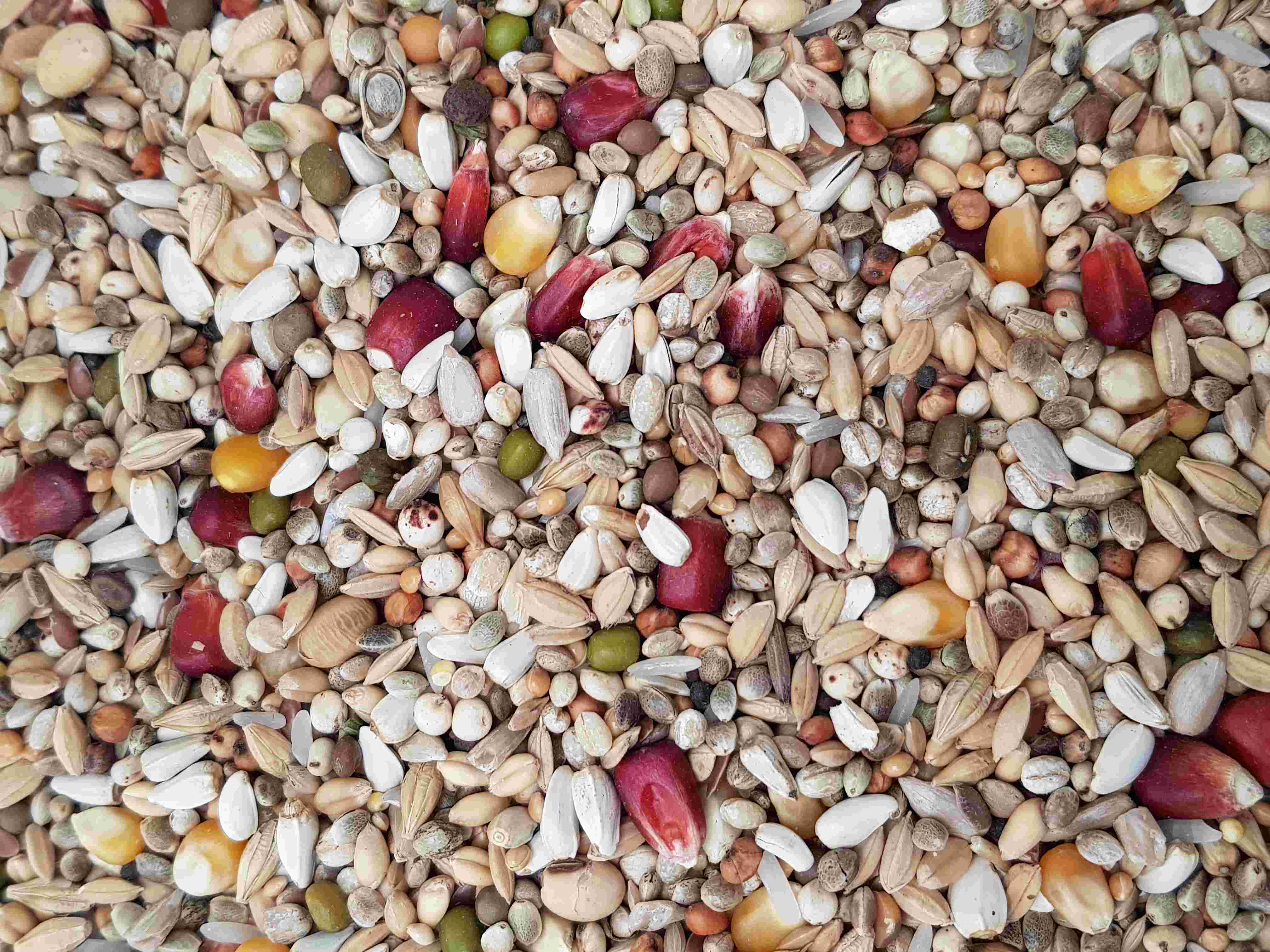 Kleiner Cribbsmais, Bordeaux-Mais, Popcornmais, Weizen, Gerste, geschälte Gerste, roter Milo, weißer Dari, geschälter Hafer, Paddy-Reis, Rundkornreis, Kardi, geschälte Sonnenblumenkerne, Leinsamen braun, Raps, Hanf, Millet, Kanariensaat, Wicken, Katjang Idjoe, getoastete Sojabohnen.