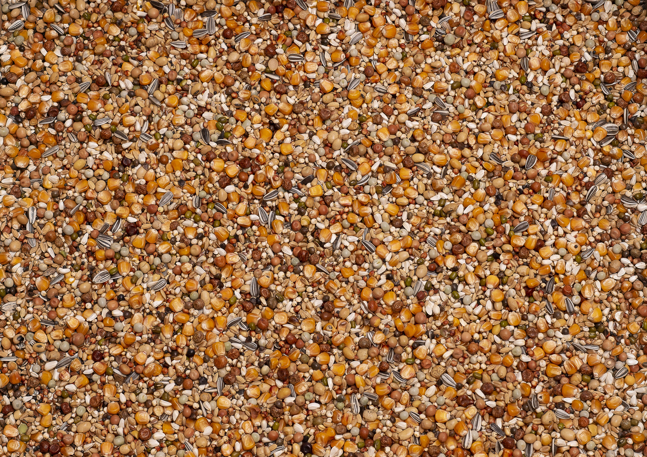 Kleiner Cribbs-Mais – weiβer Weizen – weiβer Dari – extra roter Sorghum – kleine grüne Erbsen – getoastete Soja – Kardi – Dunpeas – Maple Peas – Paddy-Reis – Katjang Idjoee – Leinsamen – Wicken – Winterpeas – gestreifte Sonnenblumenkerne – Raps – weiβer Millet – Kanariensaat – Buchweizen