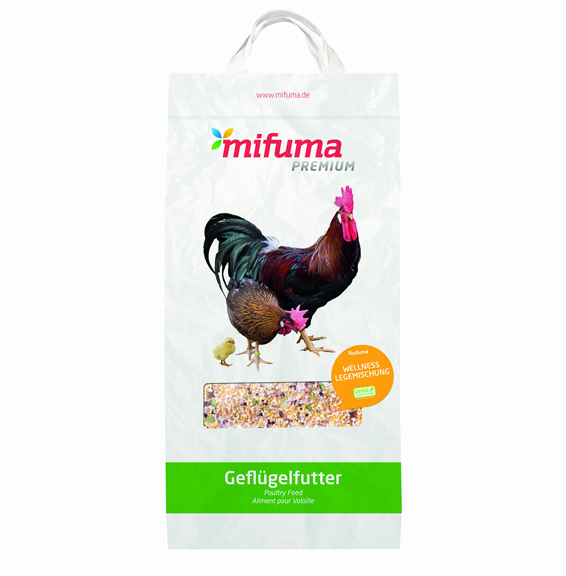 Mit der Mifuma Wellness Legemischung ernähren Sie Ihr Geflügel rundum vollwertig. Die kernige und körnige Mischung aus leckeren Sämereien, regional angebauten Getreidesorten und einem Pelletanteil schmeckt der ganzen Geflügelfamilie. Zudem produzieren Sie Ihre eigenen, leckeren Frühstückseier ganz „ohne Gentechnik“. Dieses Futter enthält ausschließlich natürliche Farbstoffe. Alle weiteren Zugaben sind nicht notwendig, da die Wellness Legemischung ein Alleinfutter ist.