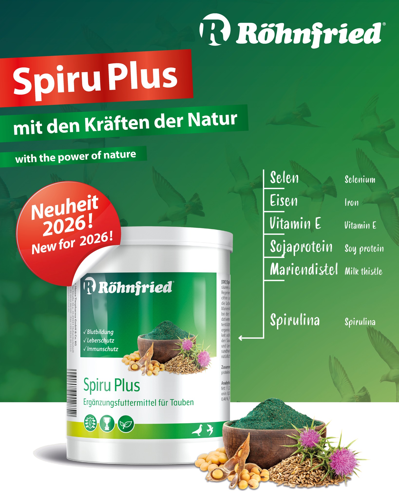 Spiru Plus liefert hochwertige Proteine, Aminosäuren und Antioxidantien – ideal für Immunsystem, Regeneration und Muskelaufbau. Das enthaltene Lecithin unterstützt den Fettstoffwechsel und schützt die Leber – besonders bei belasteten Reisetauben. Mariendistel fördert die Leberregeneration und hilft bei der Entgiftung. Vitamin E schützt Zellen vor oxidativem Stress, verbessert die Fruchtbarkeit und unterstützt die Muskelregeneration. Weiterhin ist das organische Eisen, welches eine hohe Bioverfügbarkeit aufweist, entscheidend für die Blutbildung und den Sauerstofftransport – unerlässlich für Ausdauer und Leistung. Gemeinsam fördern diese Stoffe Gesundheit, Flugfreude und Regeneration der Taube auf natürliche Weise.